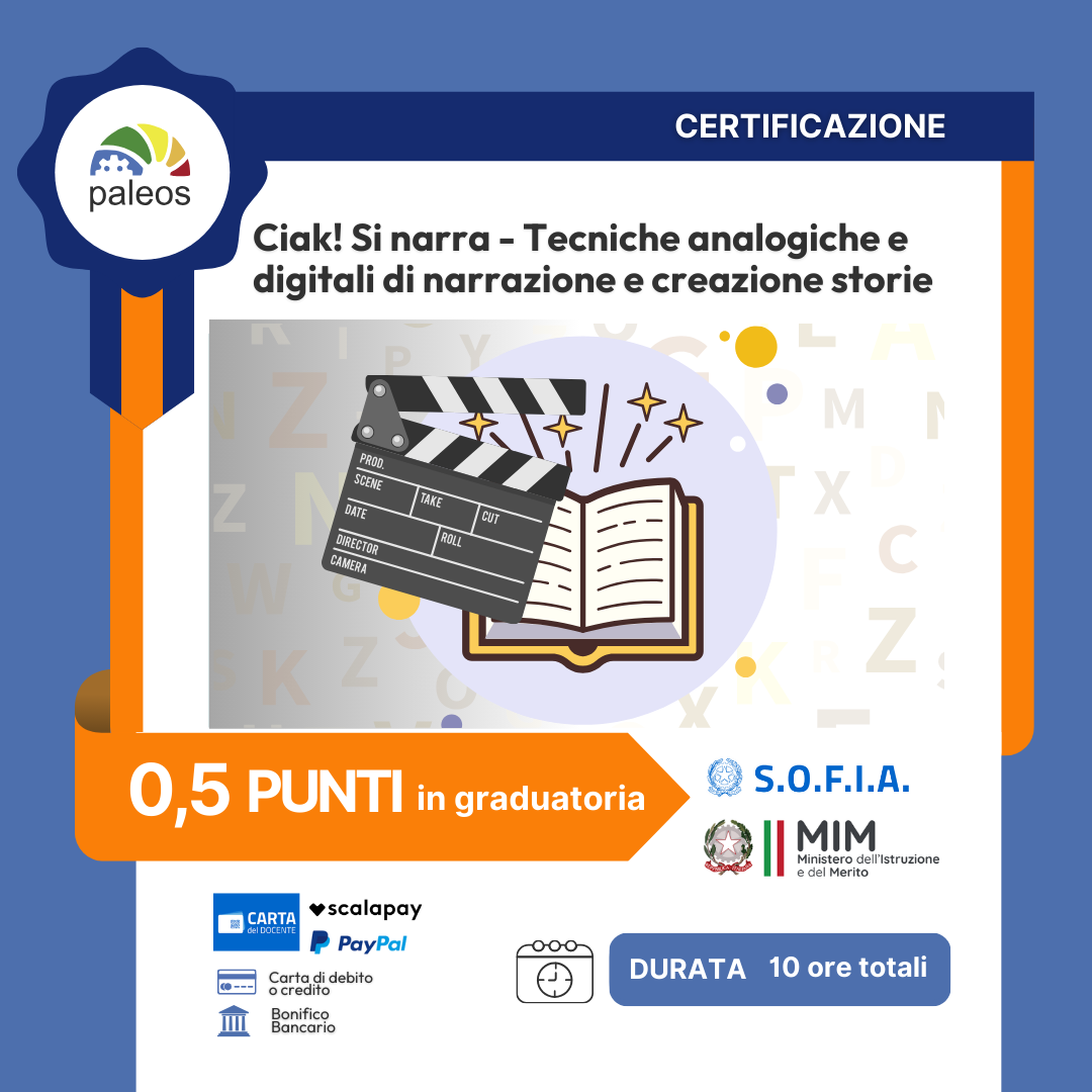 Ottieni la certificazione MIM del corso online “Ciak! Si narra: tecniche analogiche e digitali di narrazione e creazione storie” (ai sensi della D.M. 170/2016). Scopri come raccontare storie in modo innovativo e coinvolgente.